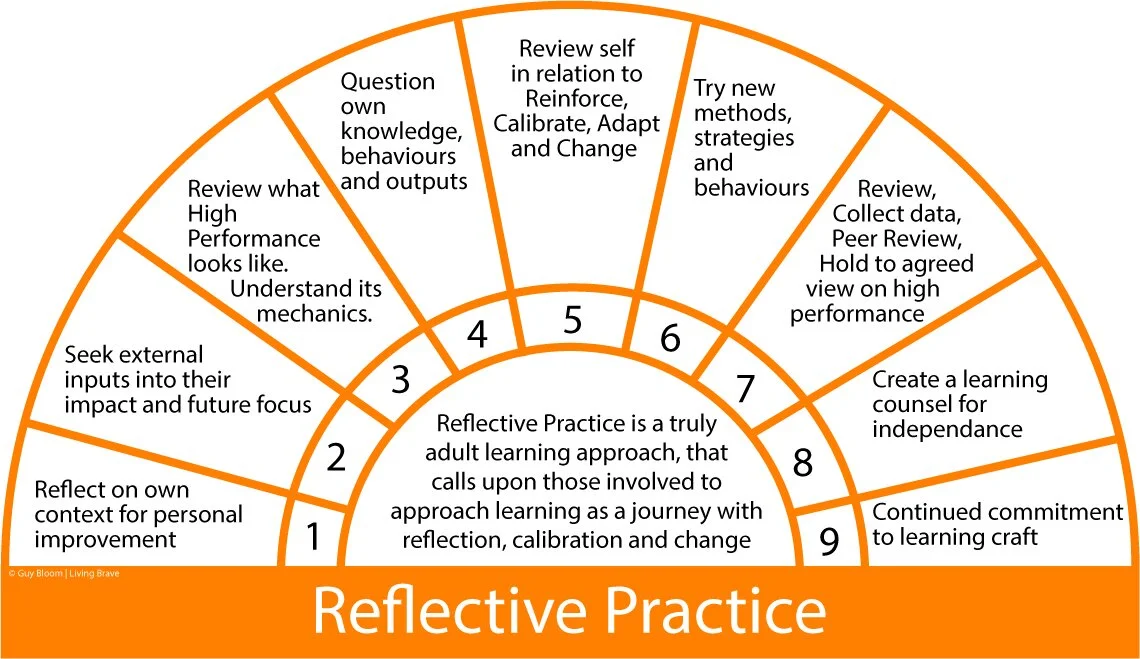 Our reflective practise model shows how we think about the way adult learning functions at its best.